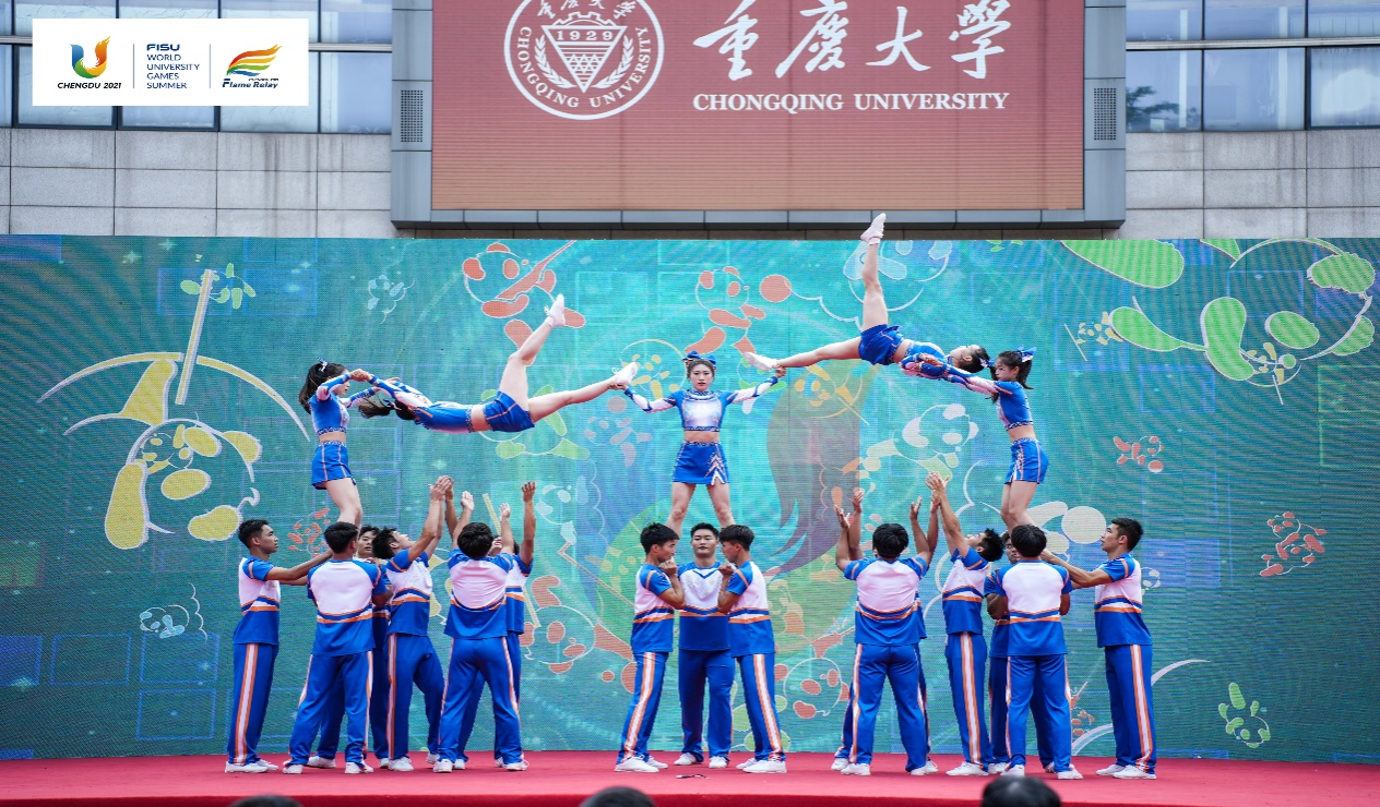 师生以“双城故事”为主题,编排演出《光荣与梦想》技巧啦啦操、《梦想的冠军》体育舞蹈等节目,向全世界展现了新时代中国大学生朝气蓬勃、昂扬向上的精神风貌,把火炬传递重庆站的气氛推向高潮。