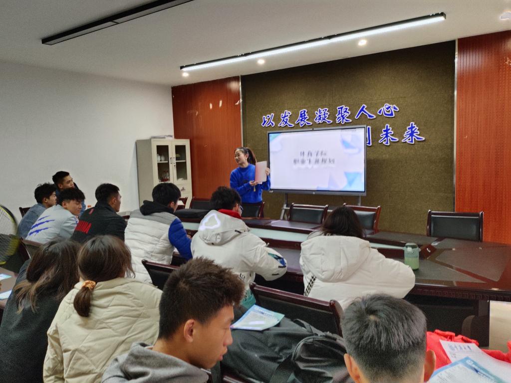 班会首先由汤婕介绍有关于体育教育专业方面近年来的就业规划方向,主要职业有教师、公司(管招生、销售等)、自由职业、公务员或选调生、入伍当兵、自主创业等,也可继续升学提高自身。