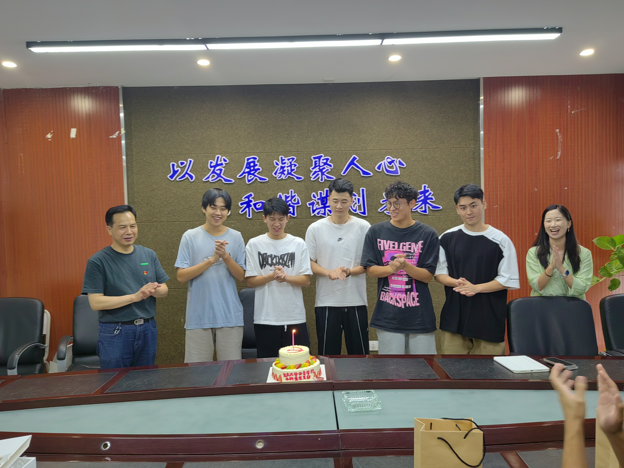 庆祝政治生日活动环节,本科生党支部为6月份过政治生日的党员同志送上了生日蛋糕,在大家的祝福声中,5名党员同志共同吹灭了蜡烛并许下了愿望,向肉视频