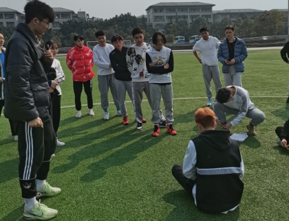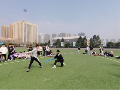 活动开始前,由学生会组织部部长唐国尧对本次活动流程进行讲解。随后进入第一个比赛“蒙眼打人”,规定在以足球场中间的半圆为比赛区域,要求比赛人员在蒙眼的情况下左右各转三圈再发起进攻,最后没有被道具棒打到的人获得胜利。