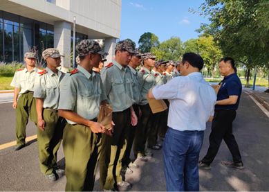 领导为2023级全体同学发放慰问品,对各位新生表达浓浓的慰问之情,同学们以标准的军礼向领导和老师们表达了深深的谢意。