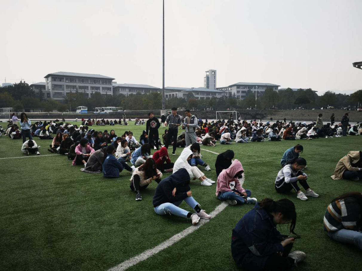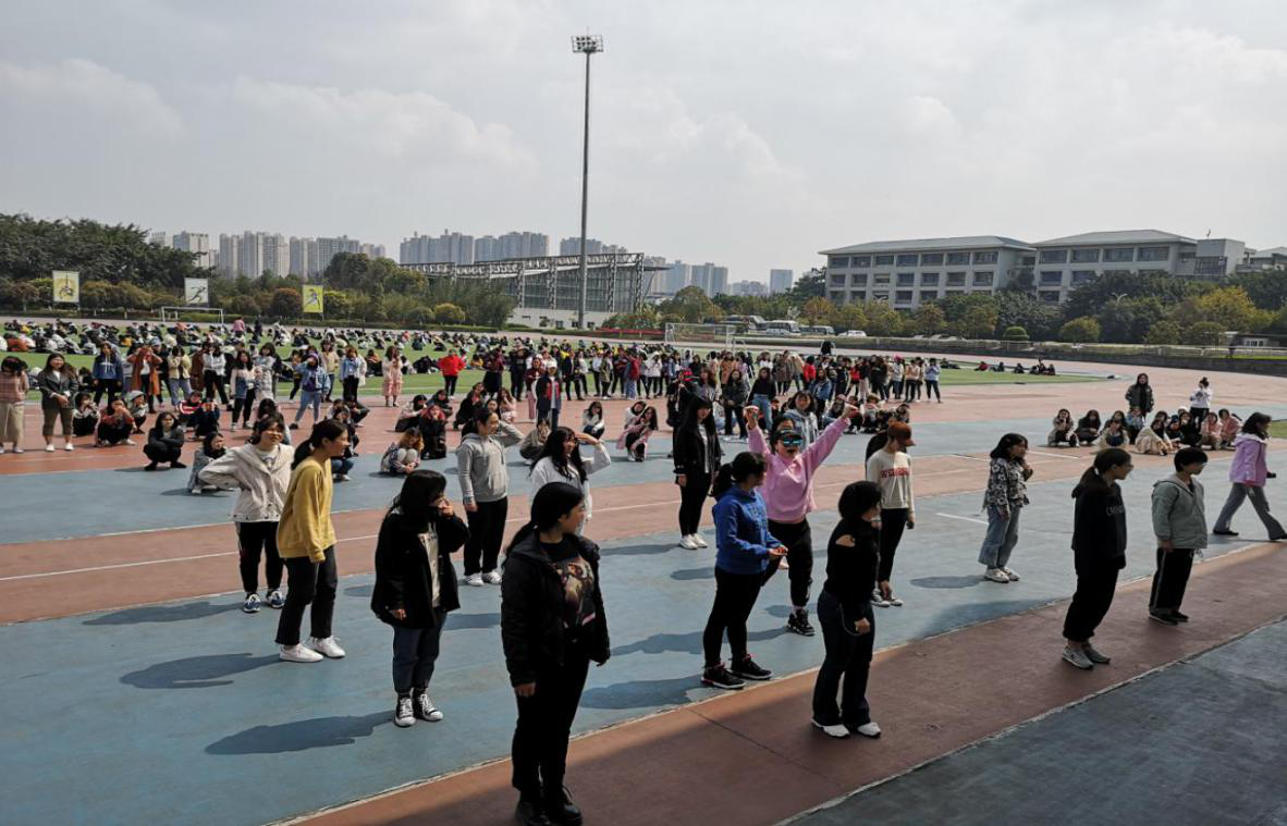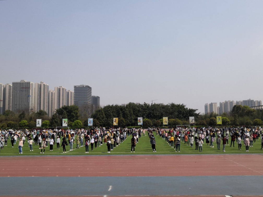 的师生只能利用中午午休时间组织学生进行合排。重庆的三月天中午达到20多度,师生们顶着热辣的太阳在操场上每天挥汗如雨,甚至有时冒着蒙蒙细雨依然坚持排练,真可谓是风雨无阻。同学们听从指挥,刻苦训练,整齐划一,喜迎“双庆”,展重大学子风采。