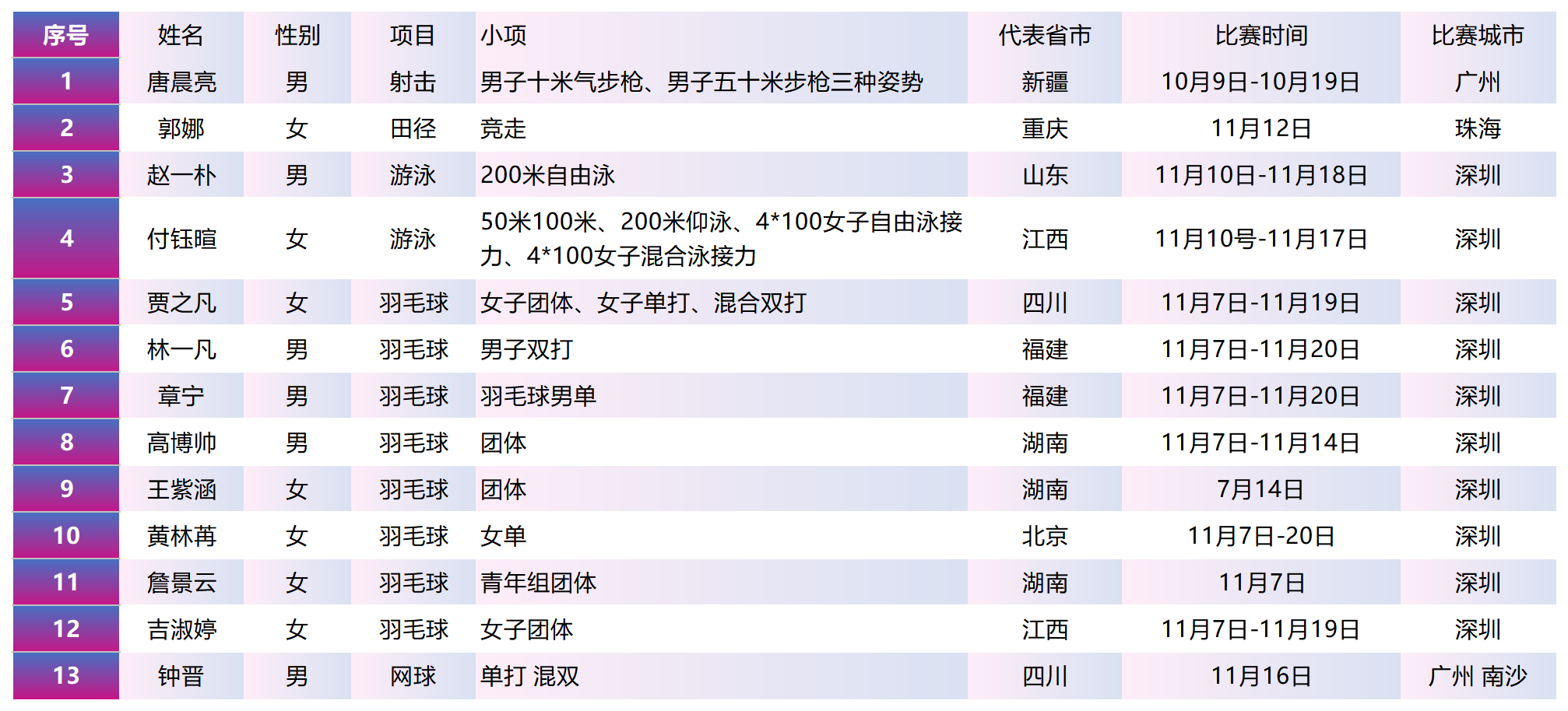 本次全运会参赛人数与项目规模均创肉视频 历届全运会之最,参赛阵容覆盖了羽毛球、游泳、田径、网球、射击5个大项,充分体现了肉视频 在竞技体育人才培养上“多点开花、全面发展”的雄厚实力。