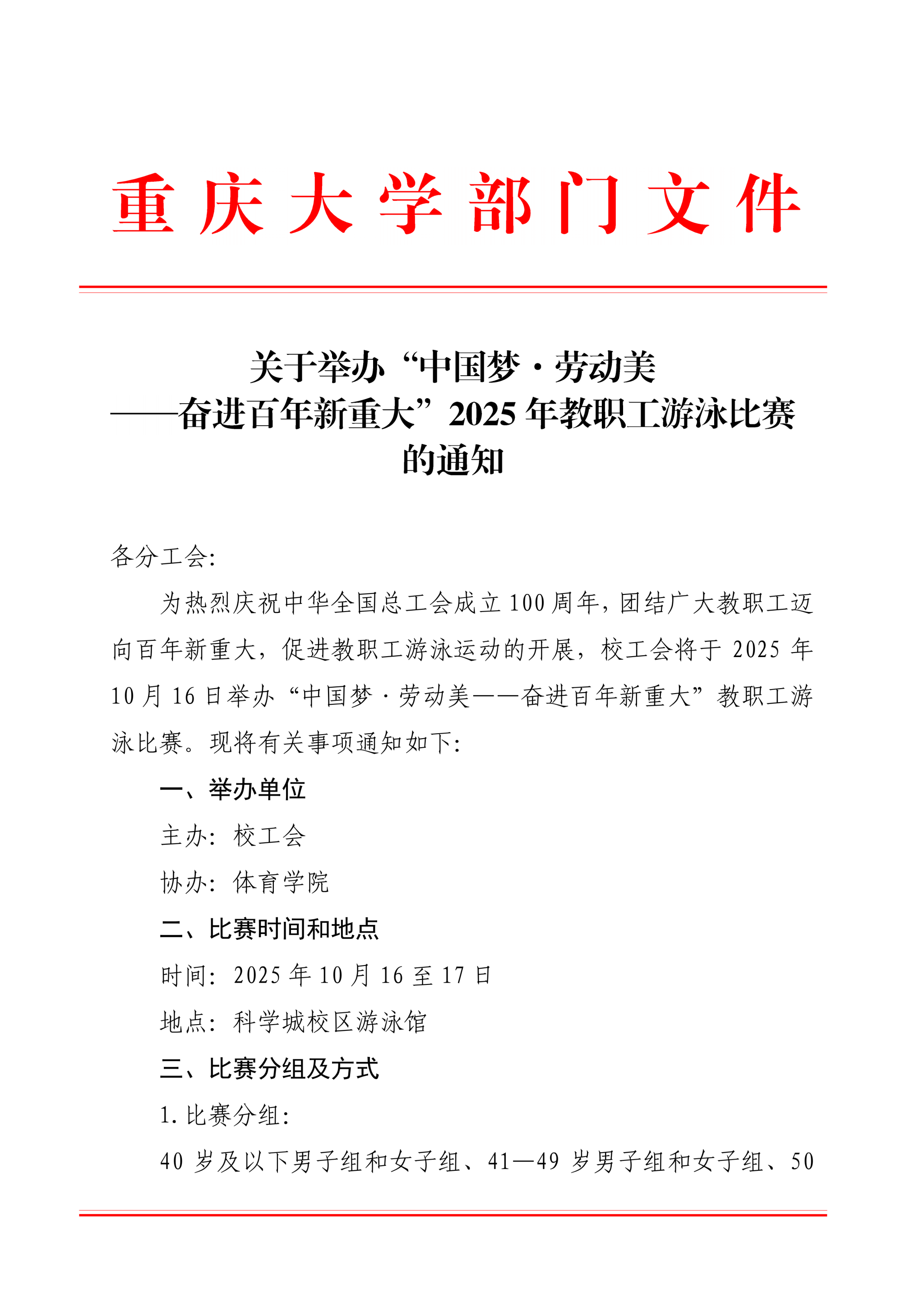 关于举办“中国梦·劳动美奋进百年新重大”2025年教职工游泳比赛的通知