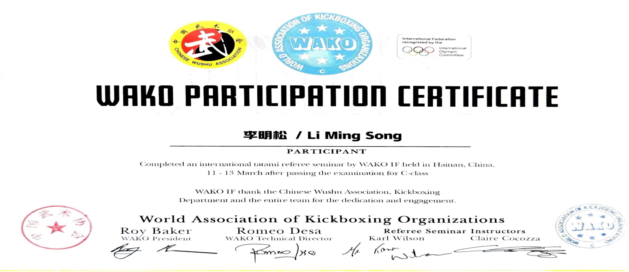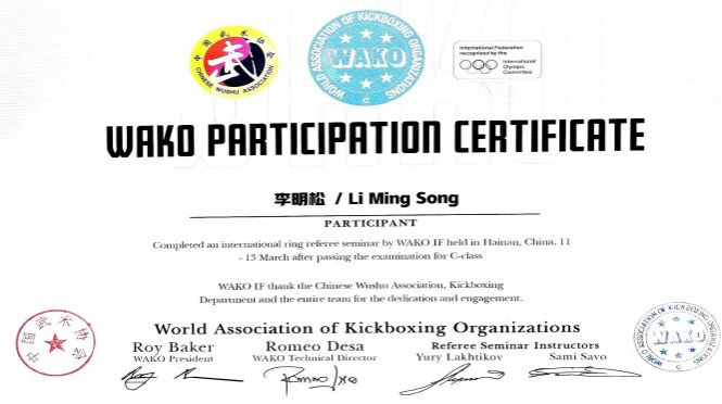 教师,也是中国知名搏击赛事推广人和裁判员,由国家体育总局武术运动管理中心和重庆市体育局武术运动管理中心推荐选拔参加此次培训。在为期一周的紧张学习培训中,李明松以认真虚心的学习态度、扎实深厚的理论基础和丰富的从业经验,在理论学习和实践操作两方面均展现了优秀的能力,赢得了世界自由搏击联合会(WAKO)及参训同行的高度评价和认可。