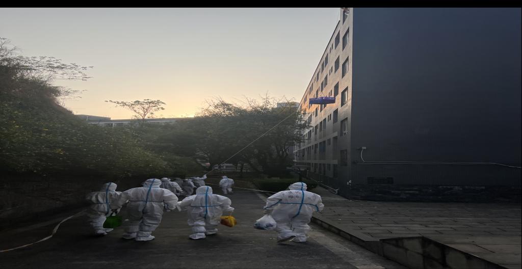 于是,在一番理性的思考过后,他在当天下午尚未全面封闭的情况下,选择了留在城管校,第一晚,他是在简陋的瑜伽垫上,盖着衣服度过了那个晚上。